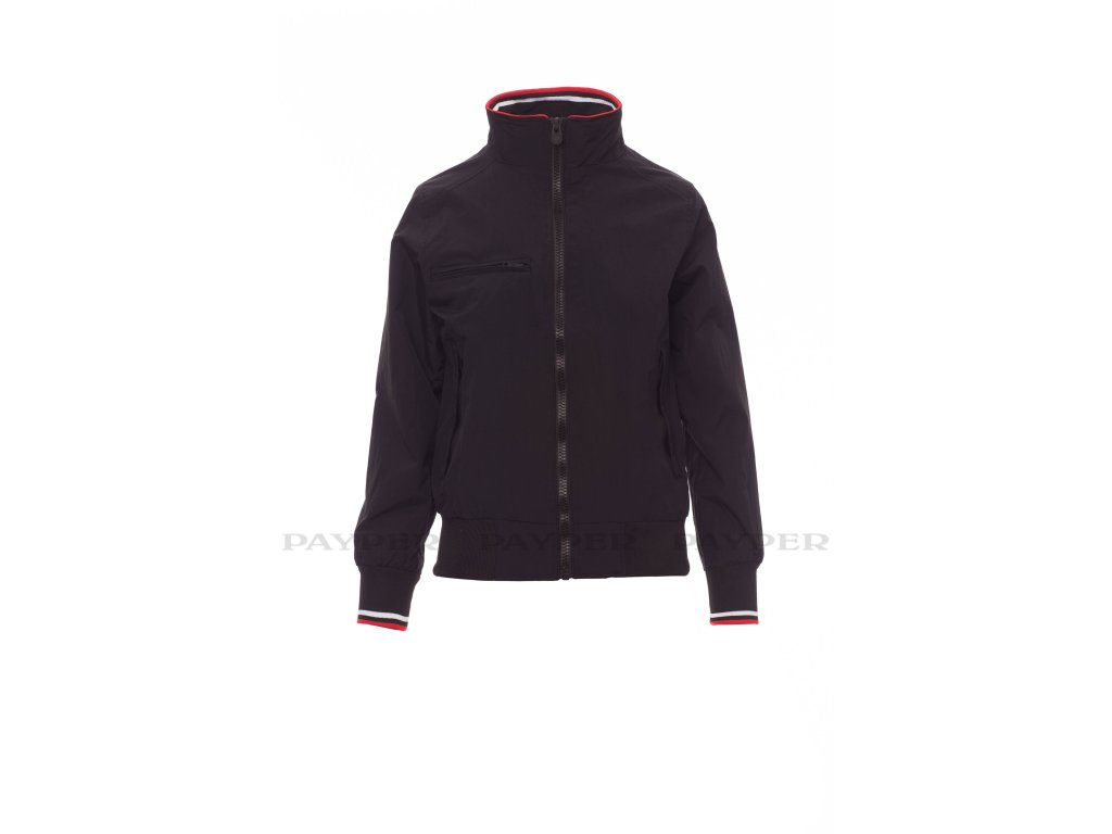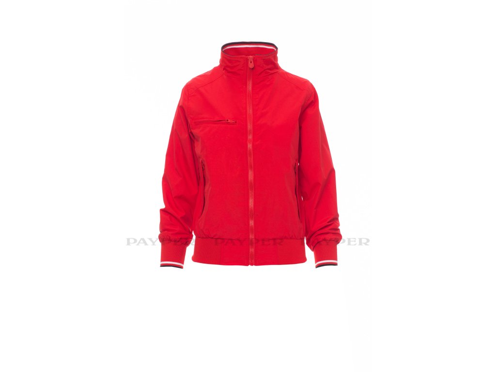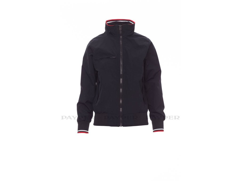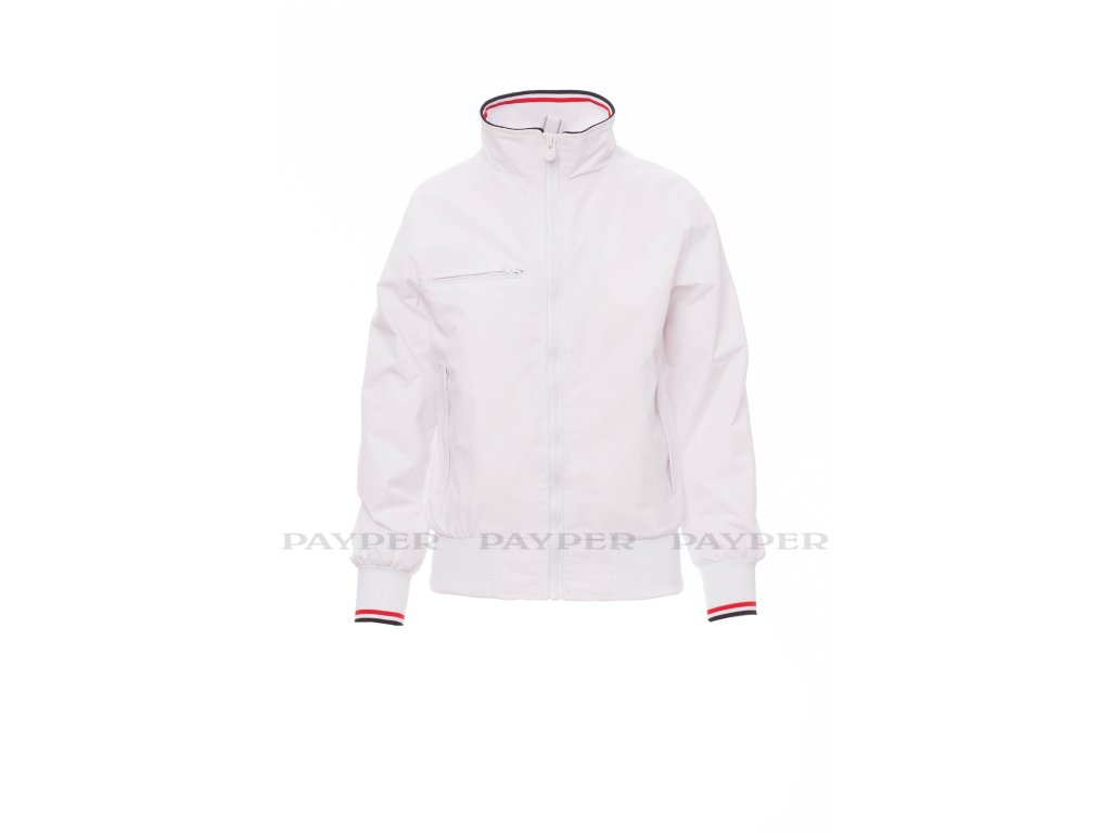Dámská ergonomická bunda s 8mm plastovým zipem s kovovým jezdcem, límeček, manžety a pas s elastickým žebrováním, dvě vnější kapsy s plastovým zipem. Vnitřek: nezateplený, síťkový, jedna kapsa na zip na smartphone s otvorem pro kabel, zip na hrudi a na zádech pro snadnější potisk a vyšívání.