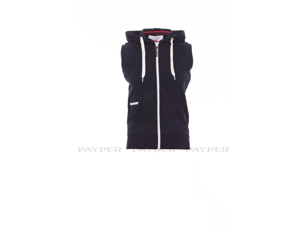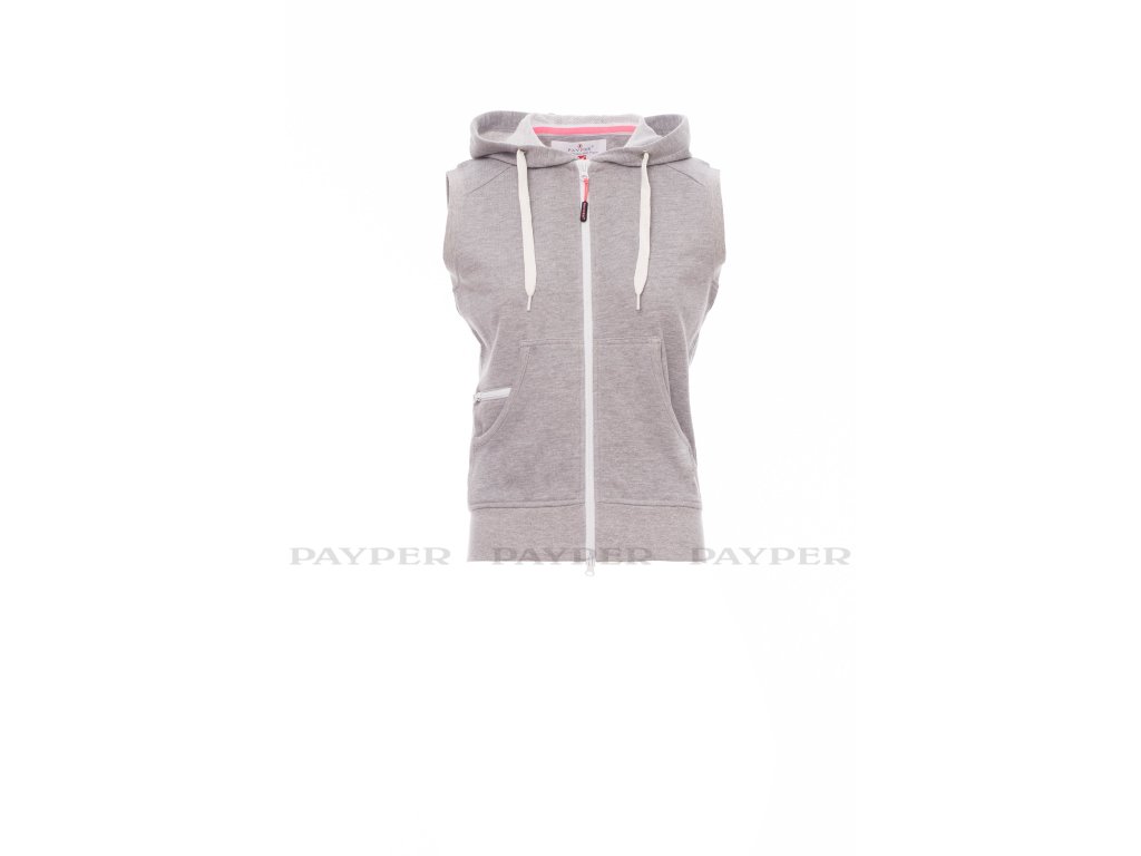Dámská mikina bez rukávů s plastovým celozipem v kontrastní barvě, s dvojitým kovovým jezdcem, tvarovaná kapuce a stahovací šňůrka kontrastní barvy, klokaní kapsa s kapsičkou na zip.