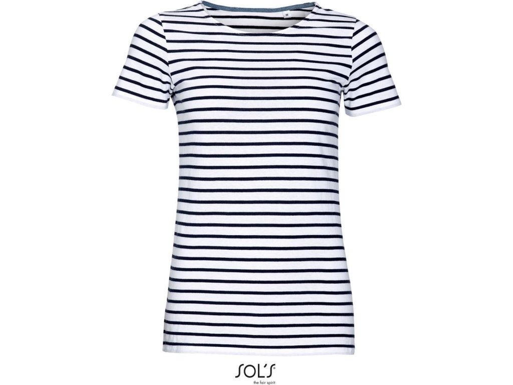 Vypasovaný střih, ženský kulatý výstřih, uvnitř krční lemovka z tkaniny chambray, pruhovaný design, štítek TearAway, neutrální velikostní štítek