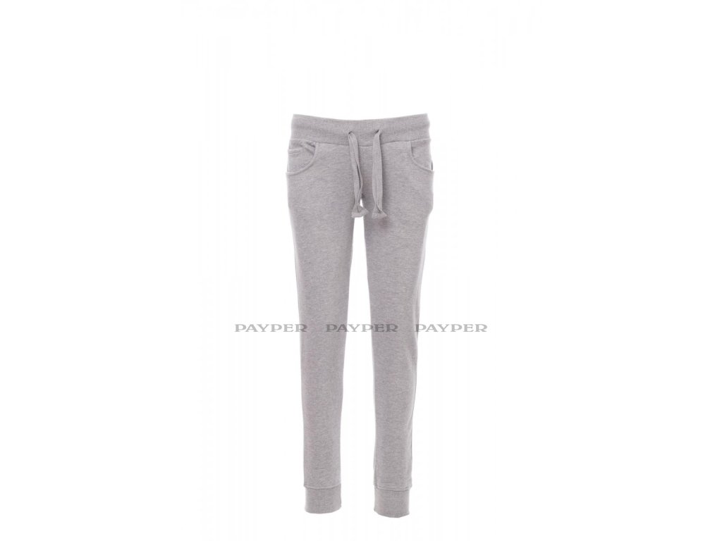 Dámské kalhoty z teplákoviny s elastickým žebrováním v pase a na nápletech nohavic, stahovací šňůrka v pase, dvě přední kapsy a malá kapsička.