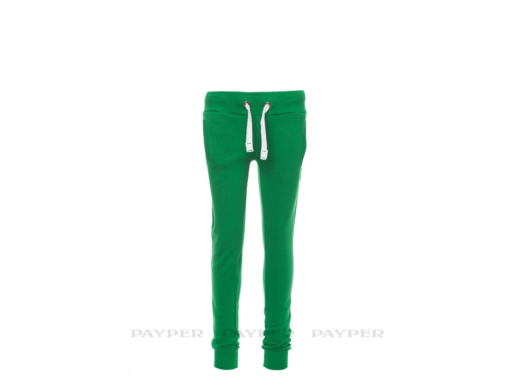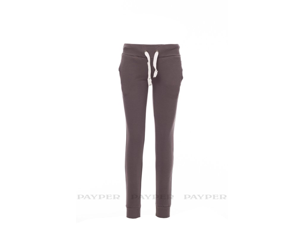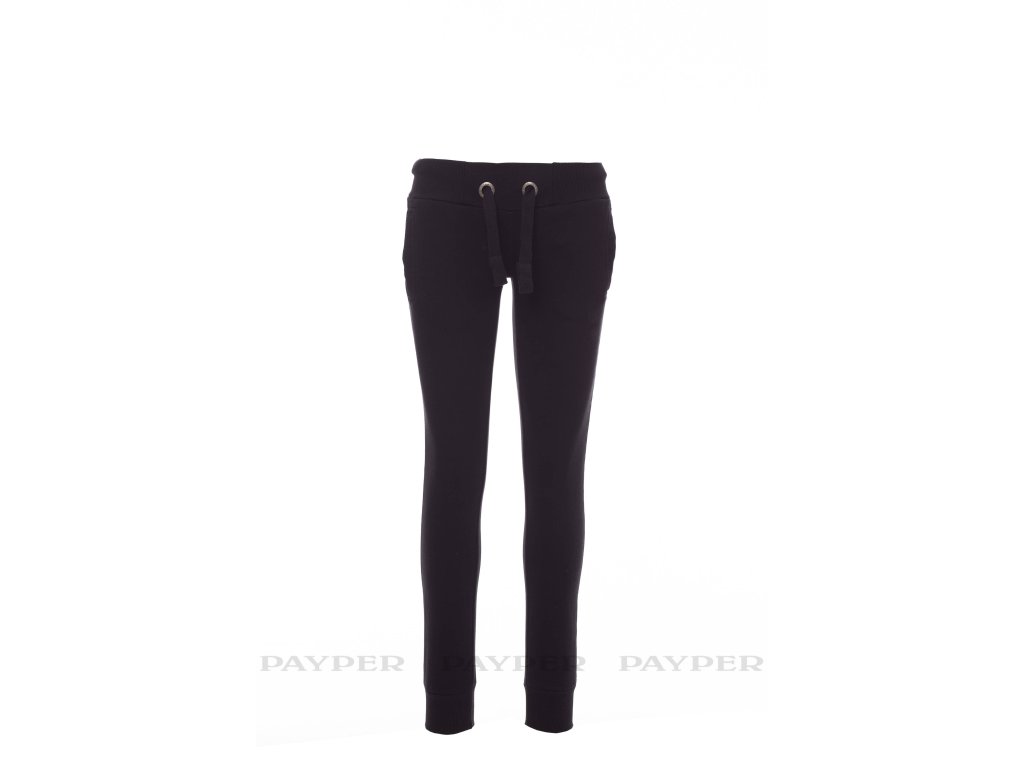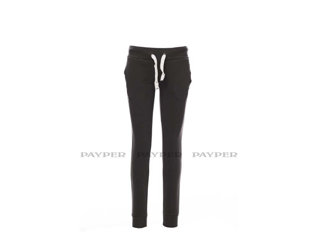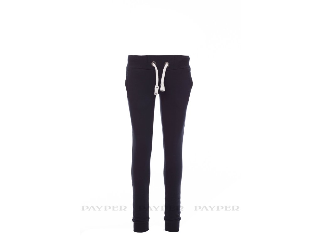Dámské teplákové kalhoty s elastickým žebrováním v pase a na nápletech nohavic, bílá stahovací šňůrka s kontrastním prošitím a kovovými kroužky, dvě přední kapsy s žebrovaným lemem a zesílenými švy.