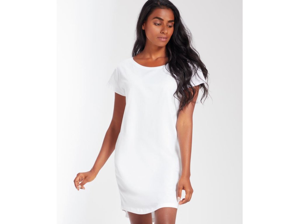 Rovný, ležérní střih, široký výstřih, motýlí rukávy bez ramenního švu, zaoblený lem, štítek TearAway, délka nad kolena, pratelné na 40°