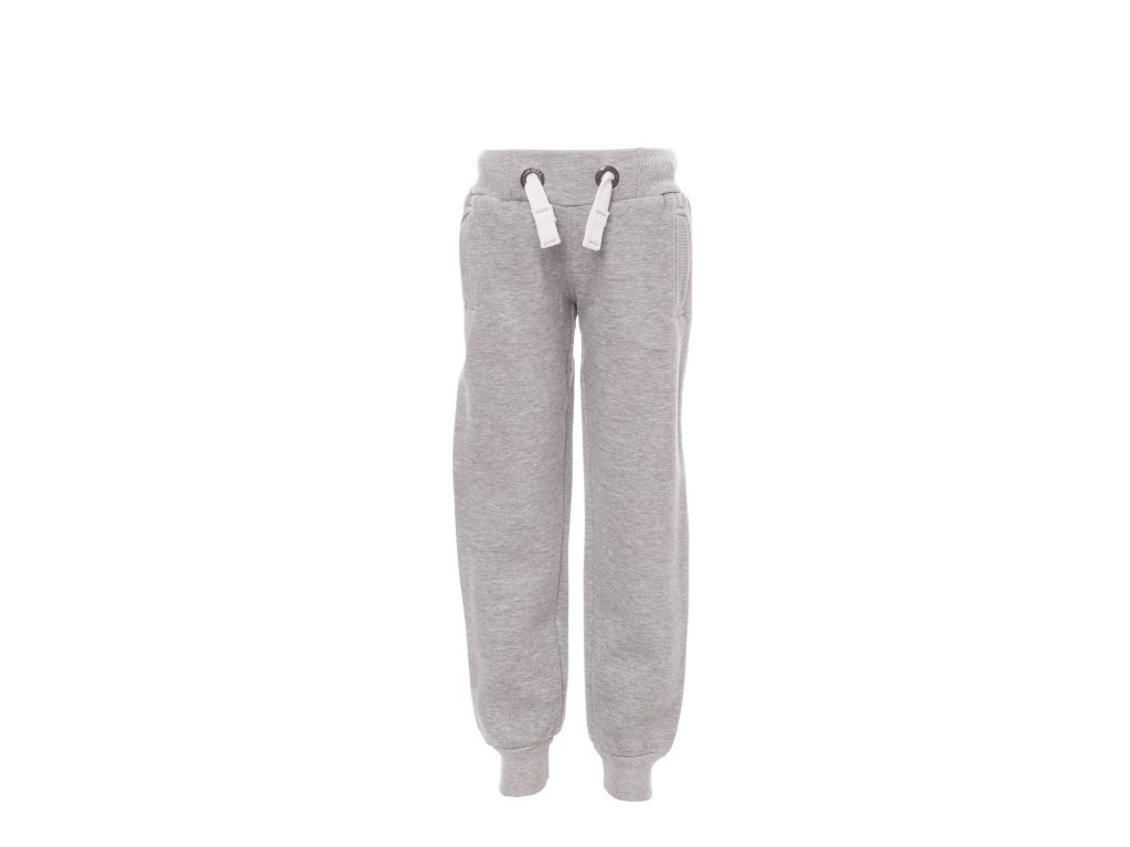 Dětské teplákové kalhoty s elastickým žebrováním v pase a na nápletech nohavic, poklopec na zip, bílá stahovací šňůrka s kontrastním prošitím a kovovými kroužky, dvě přední kapsy s žebrovaným lemem, zadní kapsička s klopou na zip a zesílené švy.