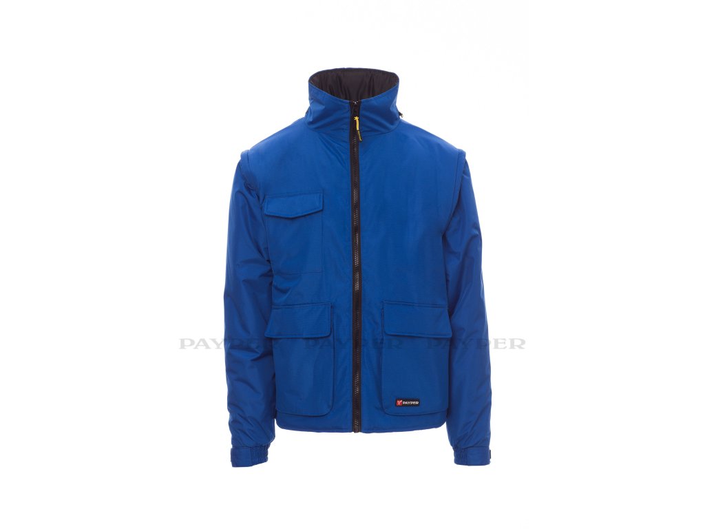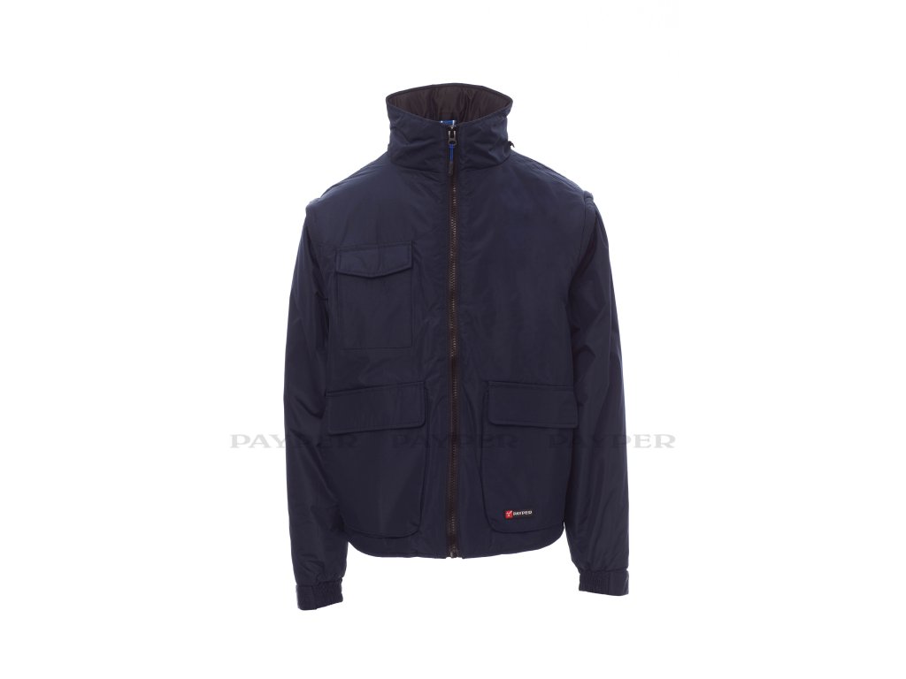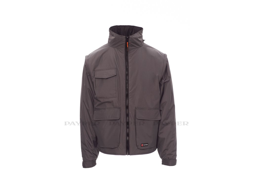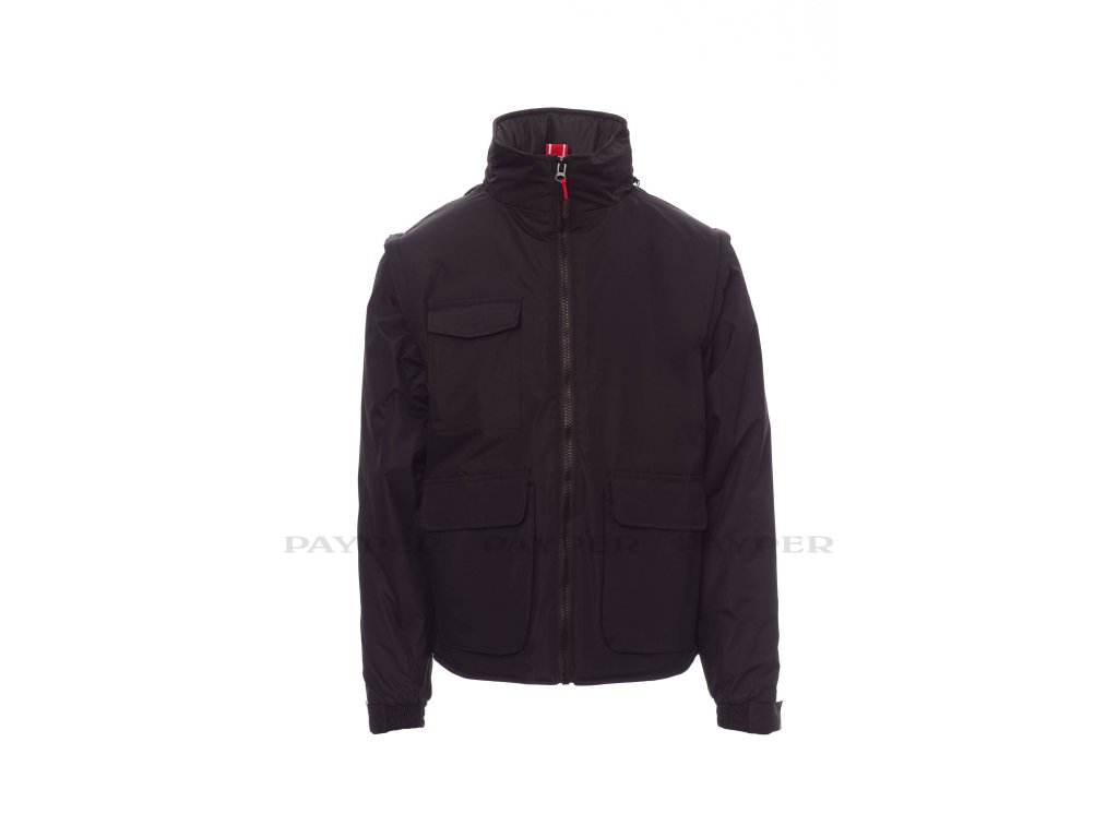 Pánská bunda, odepínací rukávy, 8mm plastový zip s kovovým jezdcem, kapuce v límci, elastický pásek a manžety na zápěstí, dvě velké přední kapsy s LOCK SYSTEMem, dvě postranní kapsy, jedna kapsa na hrudi na smartphone. Vnitřek: zateplení, zip pro snadnější potisk a vyšívání.