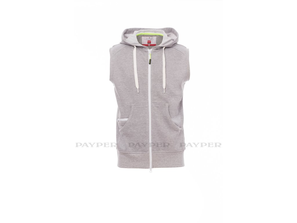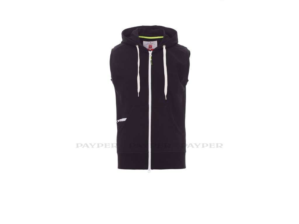 Pánská mikina bez rukávů s plastovým celozipem v kontrastní barvě, s dvojitým kovovým jezdcem, tvarovaná kapuce a stahovací šňůrka kontrastní barvy, klokaní kapsa s kapsičkou na zip.