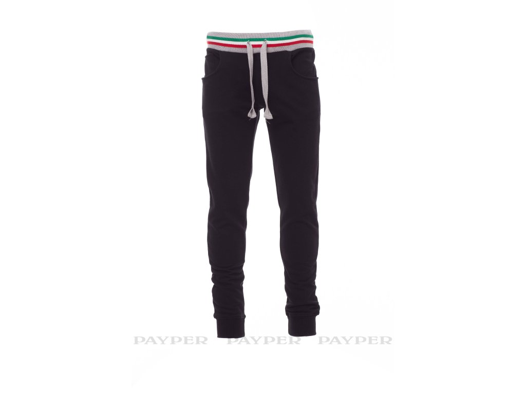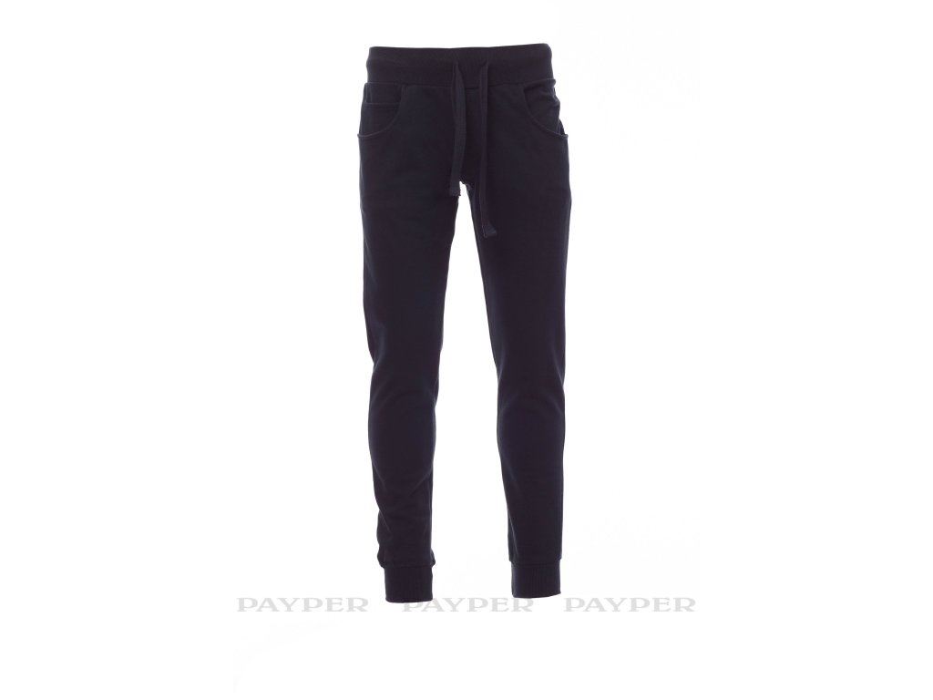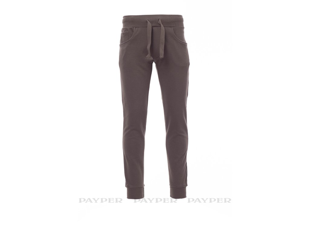 Pánské kalhoty z teplákoviny s elastickým žebrováním v pase a na nápletech nohavic, stahovací šňůrka v pase, dvě přední kapsy a malá kapsička, poklopec na zip.