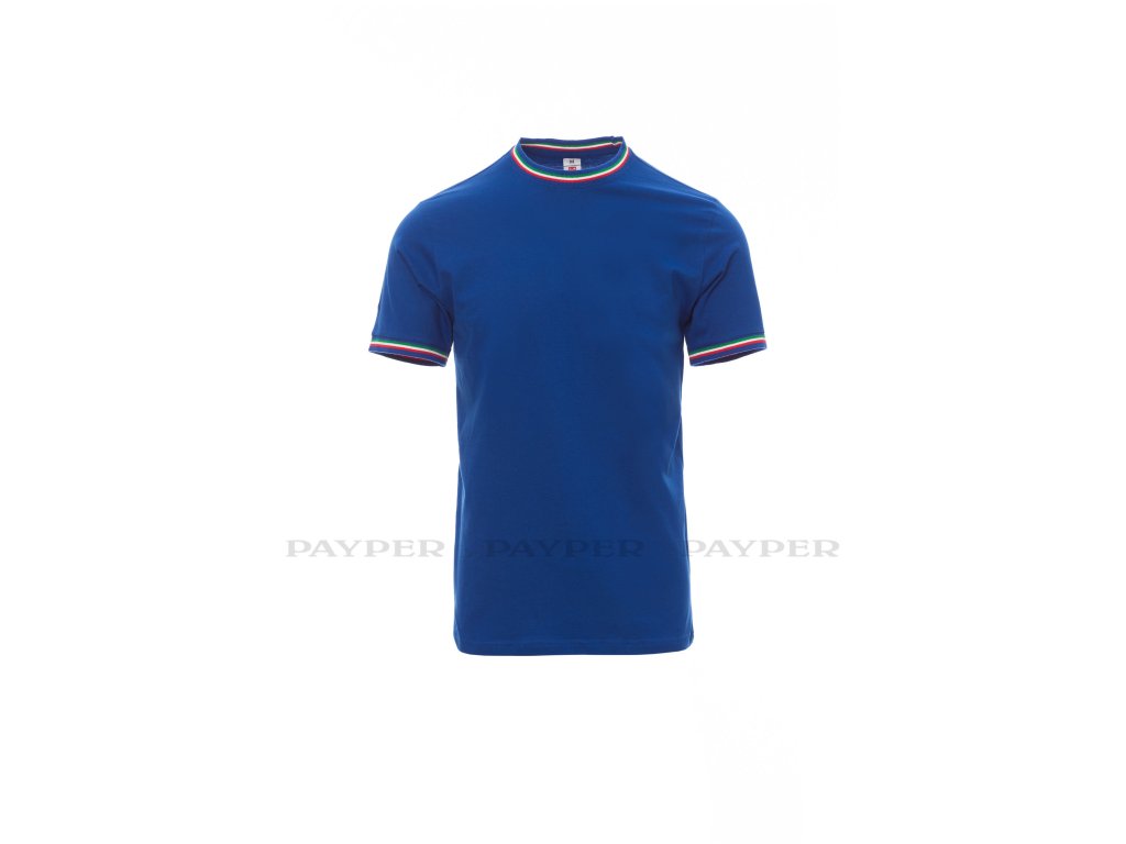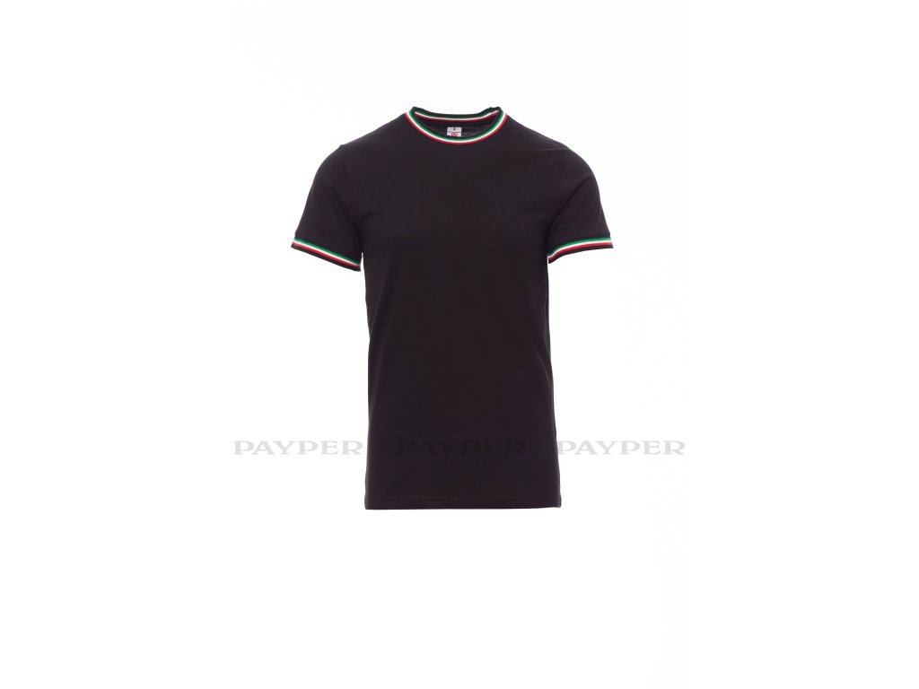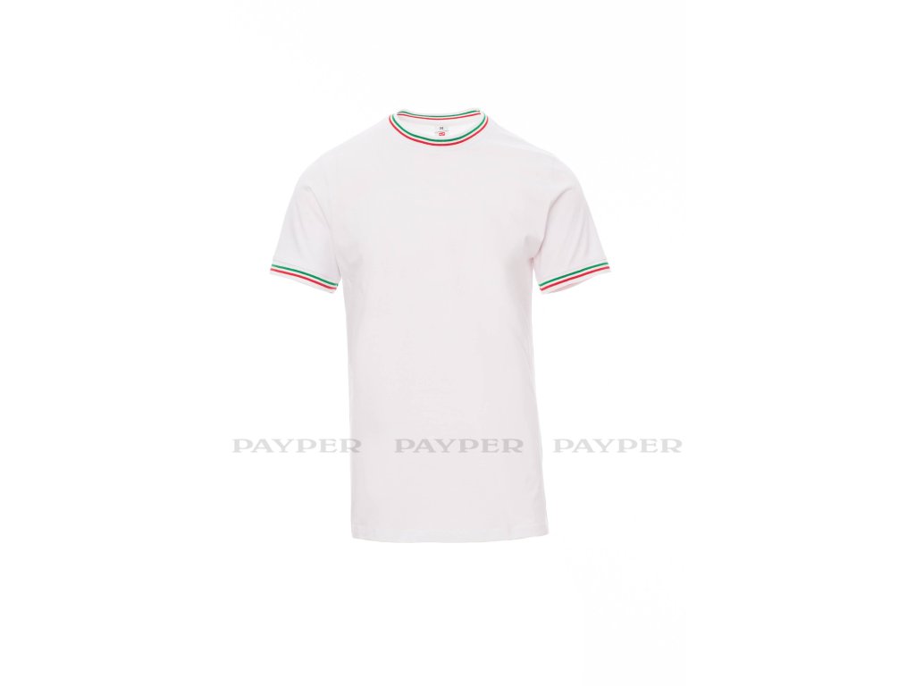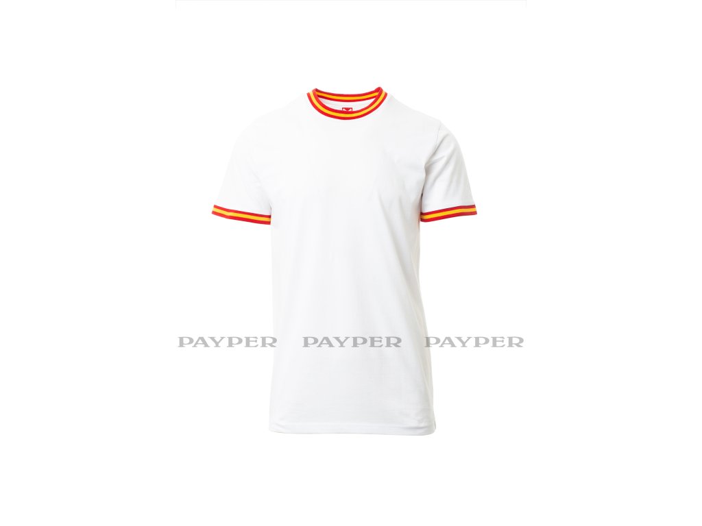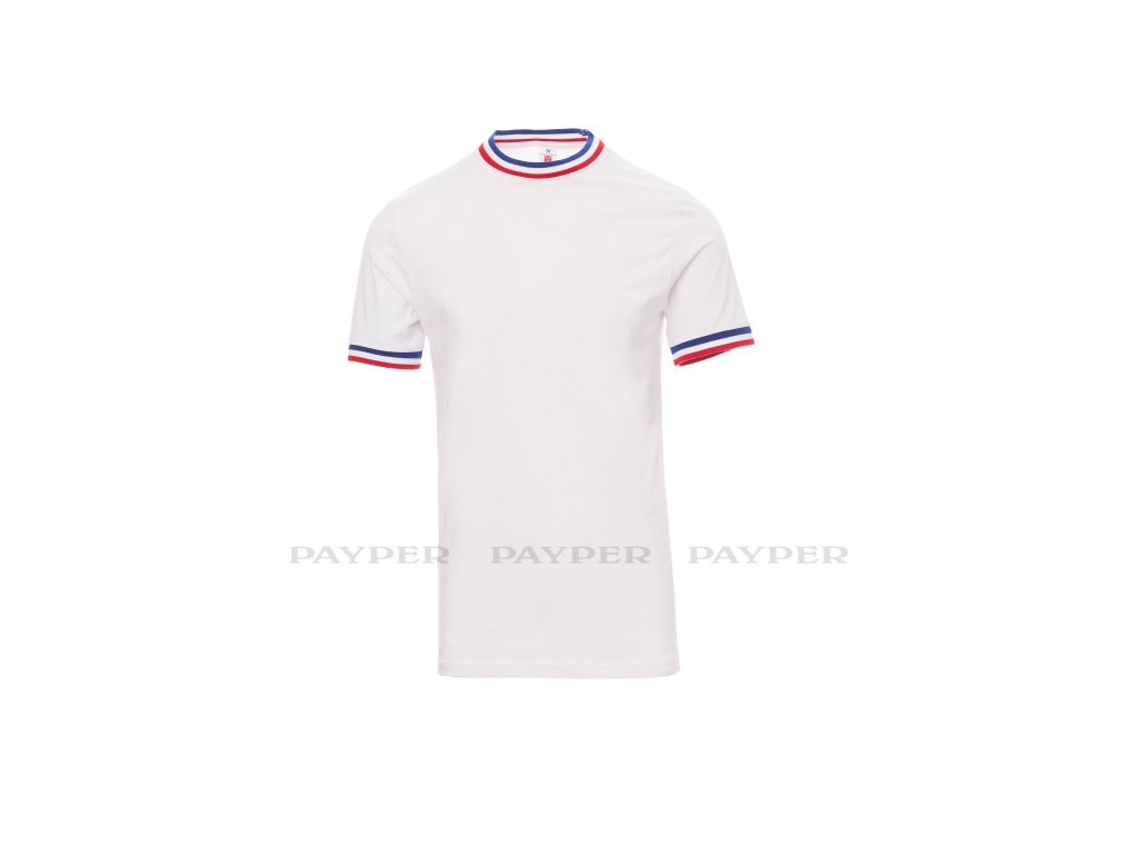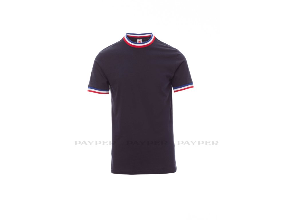 Pánské tričko s krátkým rukávem a kulatým výstřihem, límeček a lem rukávu s kontrastní trikolórou, 2,3 cm pružný žebrovaný lem ze směsi spandex u krku s vrchním prošíváním na přední straně, vyztužovací páska od ramene k rameni viditelná na límečku, pružné švy, postranní sešití.